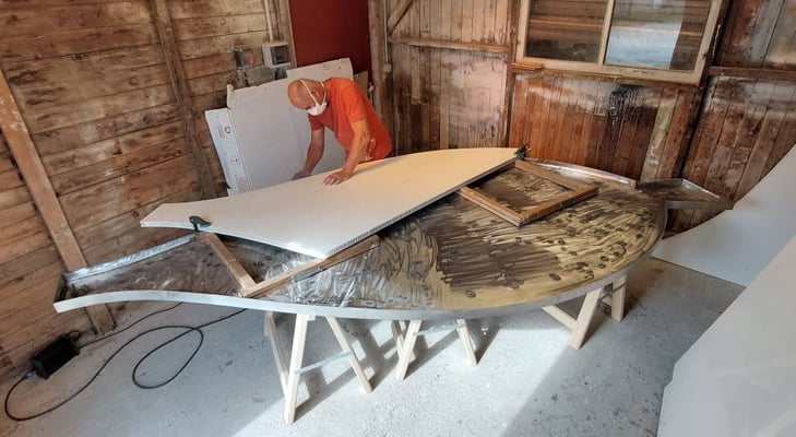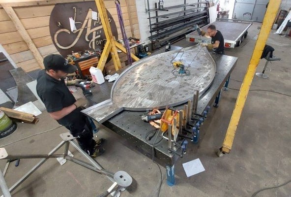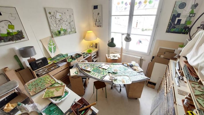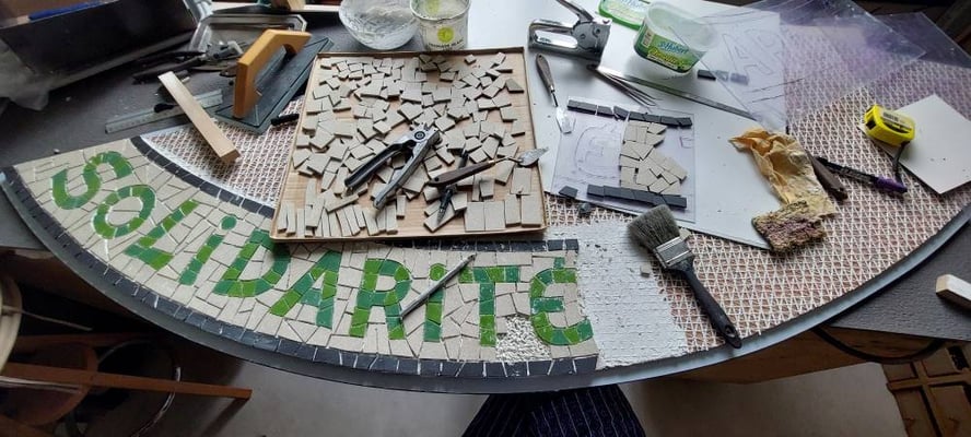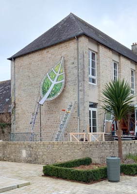 Un vrai travail d'équipe avec les SERVICES TECHNIQUES de la Mairie, l'entreprise "l'ART DE FER " qui réalise la forme en inox, et GILLES FRENEE qui assure la préparation des supports, notamment la partie cruciale des collages. Tout est étudié pour que l’œuvre soit pérenne.