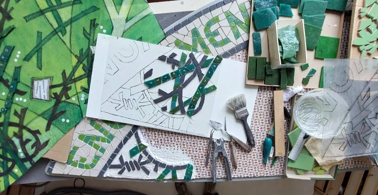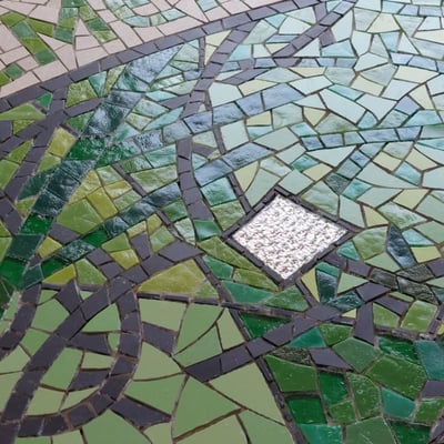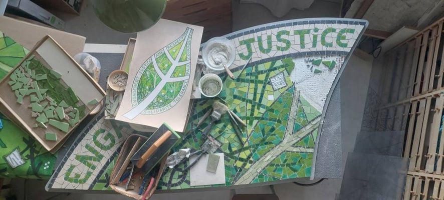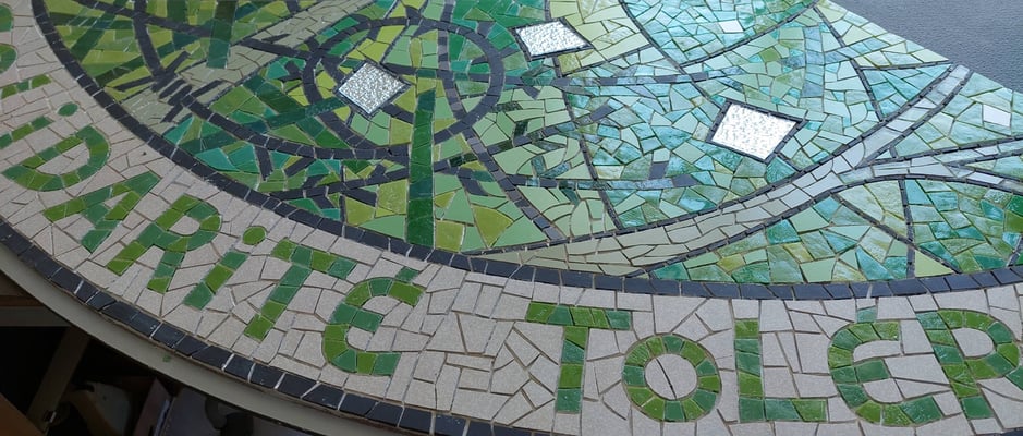 j'ai voulu cette mosaïque comme une forme en mouvement : un flambeau d'espérance, un arbre de vie, une flèche qui pointe le ciel.
