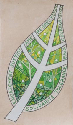 Le cahier des charges imposait de figurer la croix de Lorraine. J'ai choisi de lui donner la place centrale et de la faire rayonner, dans une forme dynamique et organique. Transposée en un élément végétal, inscrite dans les nervure d'une simple feuille, elle devient la structure qui irrigue la composition toute entière.